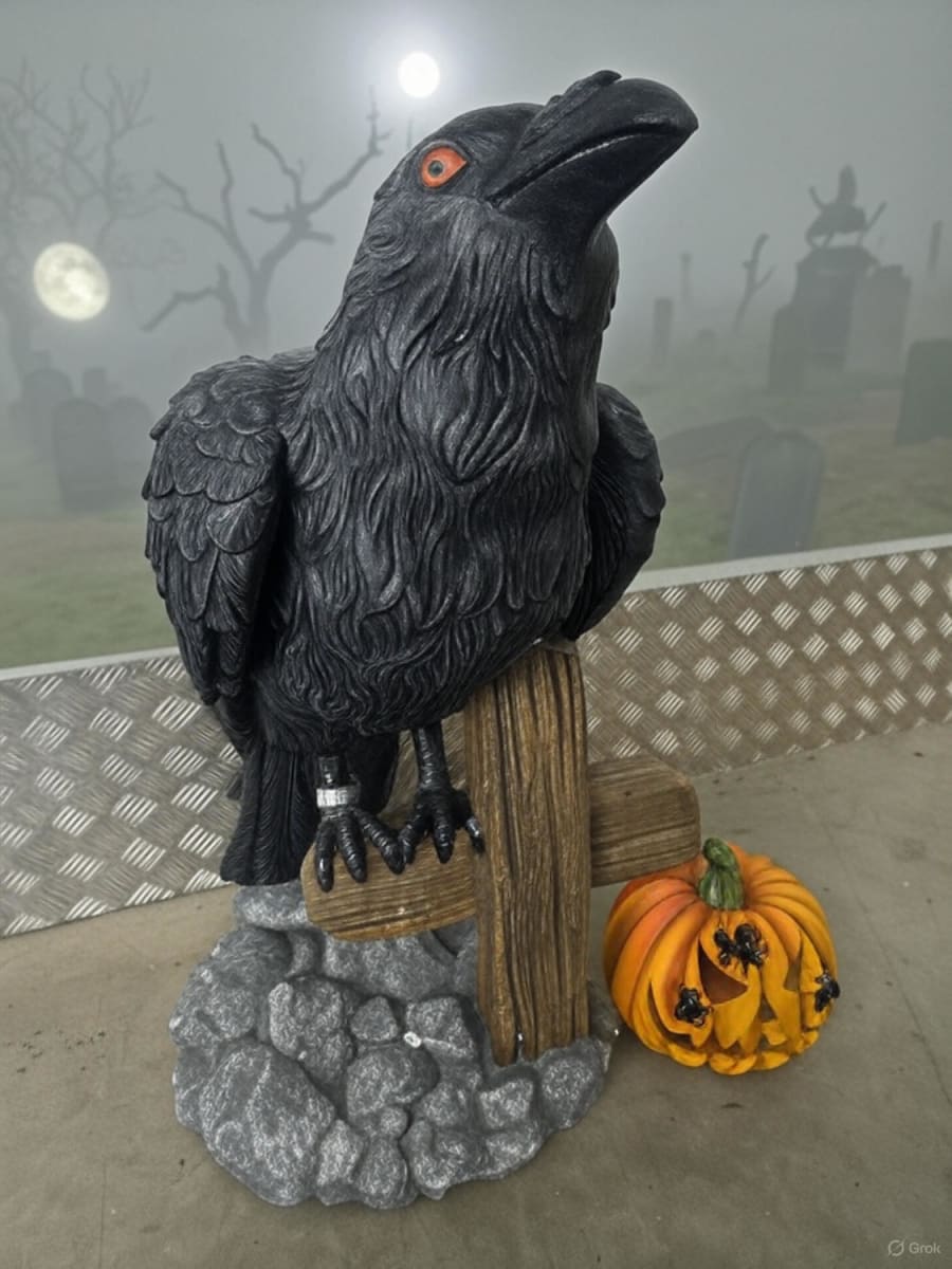 Elevate your spooky setup with our lifelike raven and pumpkin Halloween display, perfect for haunted houses, seasonal events, themed parties, shop window displays, or photo backdrops.