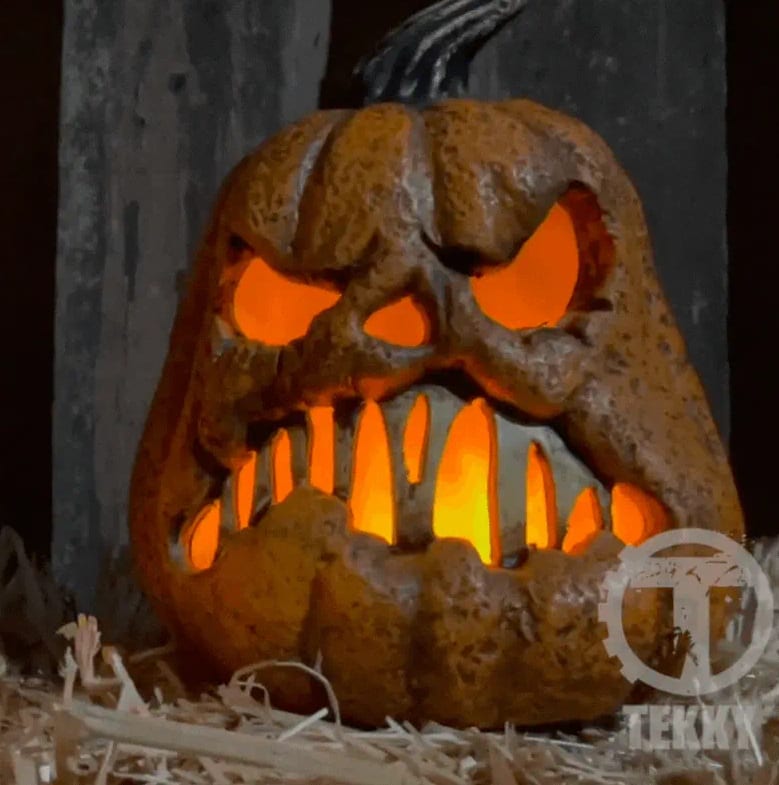 Perfect for haunted houses, Halloween parties, scare attractions, or theatrical sets, this pumpkin looks especially menacing in dim lighting thanks to its internal orange glow and sinister sculpted expression.