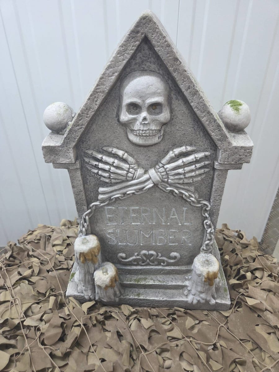 Bring a haunting atmosphere to your Halloween party, haunted house, or themed event with our Eternal Slumber tombstone prop. Featuring a skeletal face with crossed bones, dripping wax candles, and mossy stone details, this decoration adds a chillingly realistic graveyard effect.