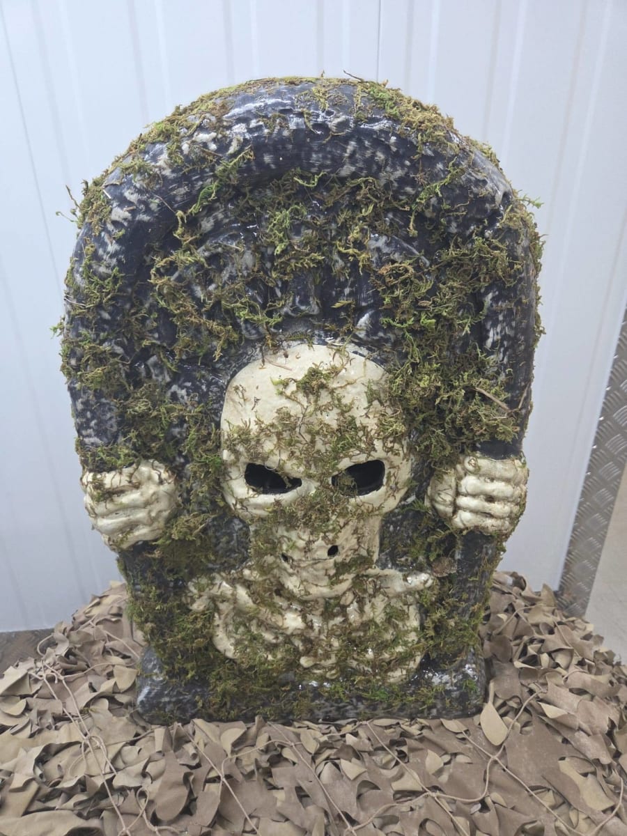 Unleash the terror at your Halloween party or haunted house with our Creeping Skull tombstone prop. This eerie decoration features a skeleton clawing its way out of a moss-covered gravestone, creating a chilling effect that’s guaranteed to frighten and impress.