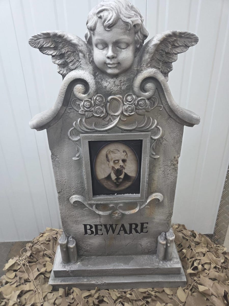 Create a spine-chilling atmosphere with our Beware tombstone prop, perfect for Halloween parties and haunted attractions. This eerie gravestone features a stone angel with wings, a haunting portrait that adds a ghostly presence, and engraved lettering that warns: “BEWARE”.