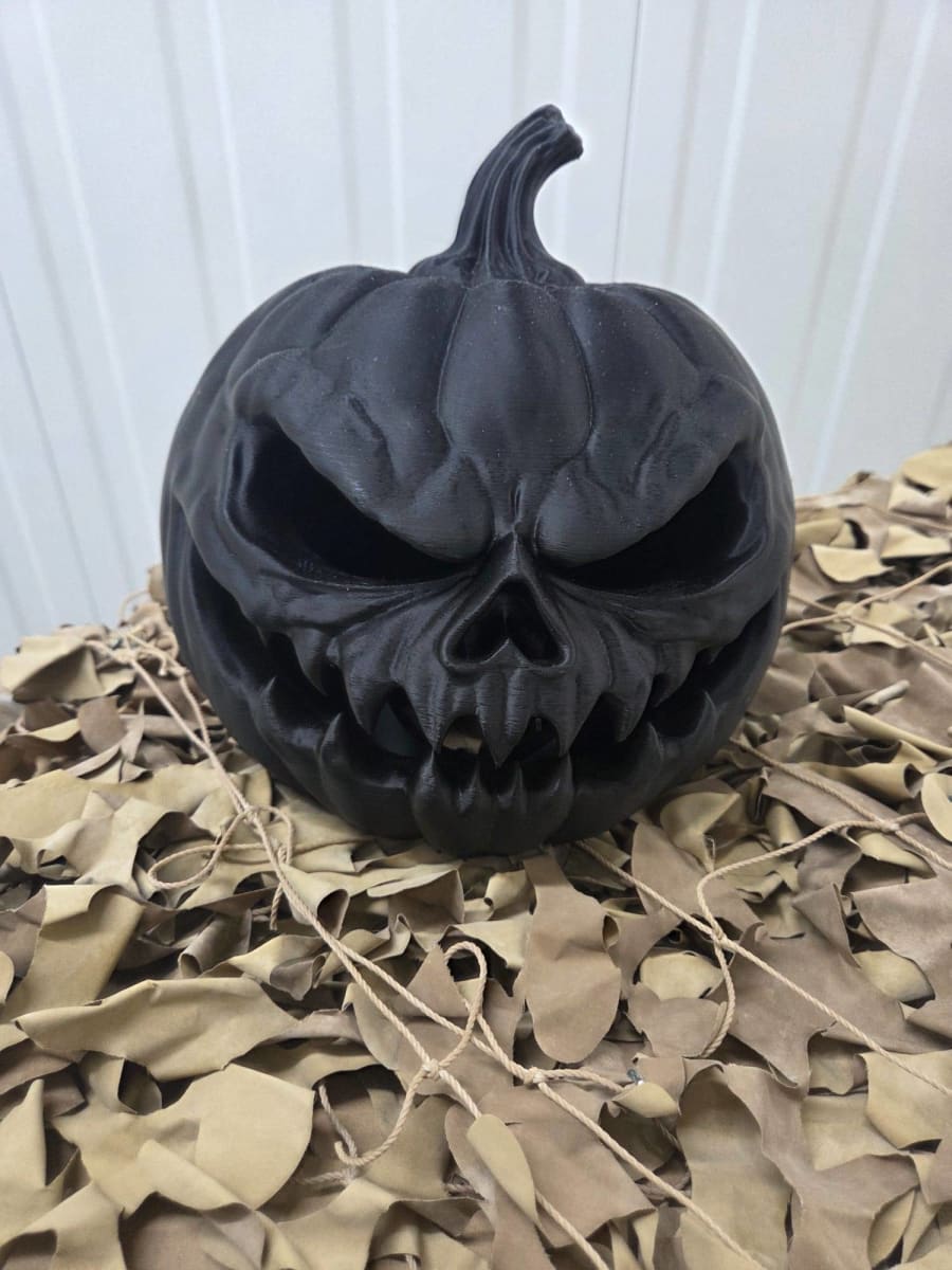 This dark gothic pumpkin features a menacing carved face with sharp fangs, perfect for a sinister Halloween vibe.