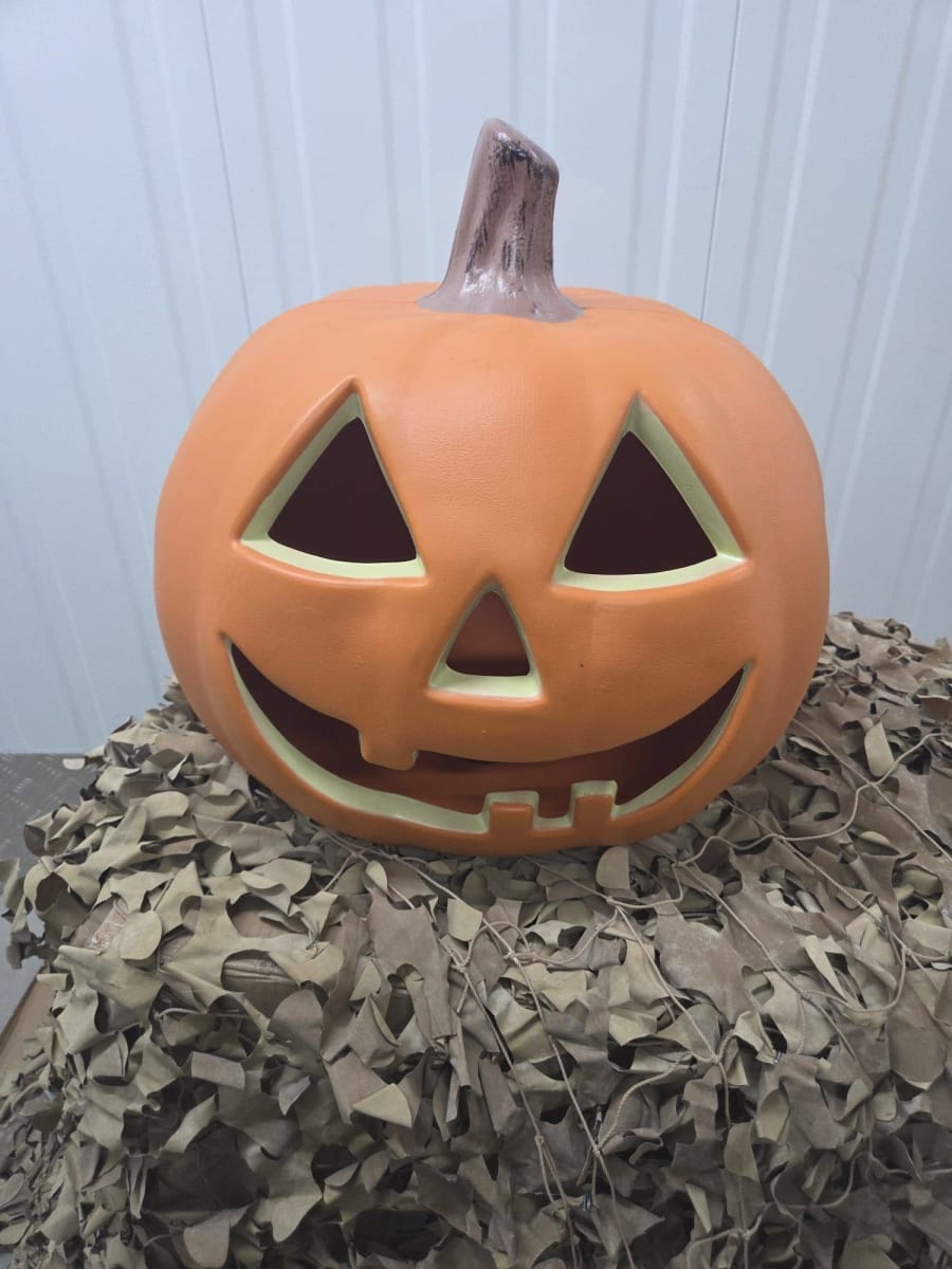 A bright, traditional jack-o’-lantern with a carved smiling face for a fun, family-friendly Halloween feel.