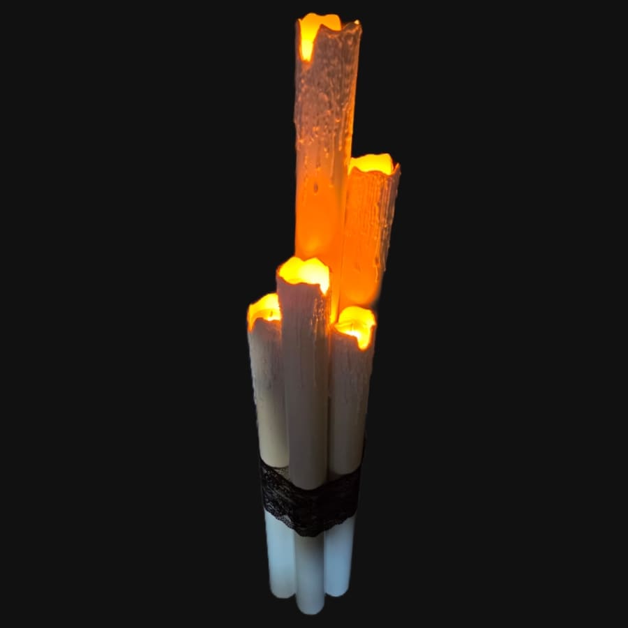 Each candle is carefully sculpted to look authentic, with a textured wax-like finish and gently “melted” tops. The soft amber glow flickers realistically, creating a warm and inviting ambience that feels magical, mysterious, and timeless all at once. Bound together with elegant black lace, the candles form a striking feature that looks equally at home in romantic, gothic, or theatrical settings.