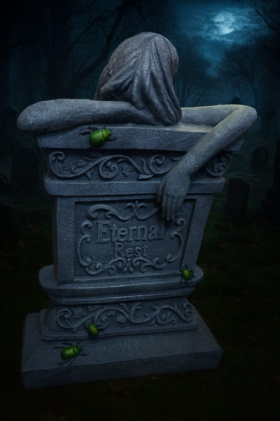 Turn up the fright factor at your next event with our over 4ft tall “Eternal Rest” gravestone prop. Featuring a draped figure leaning over a detailed tombstone with creepy crawling beetles, this chilling decoration looks hauntingly real — perfect for creating an eerie atmosphere.