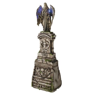 Create a chilling centerpiece for your haunted yard with this Light-Up Angel Tombstone. Standing tall and ominous, this eerie statue features a grim angel figure perched atop a weathered tombstone engraved with skull motifs and gothic details. The illuminated blue wings add an otherworldly glow, making it perfect for nighttime displays.
