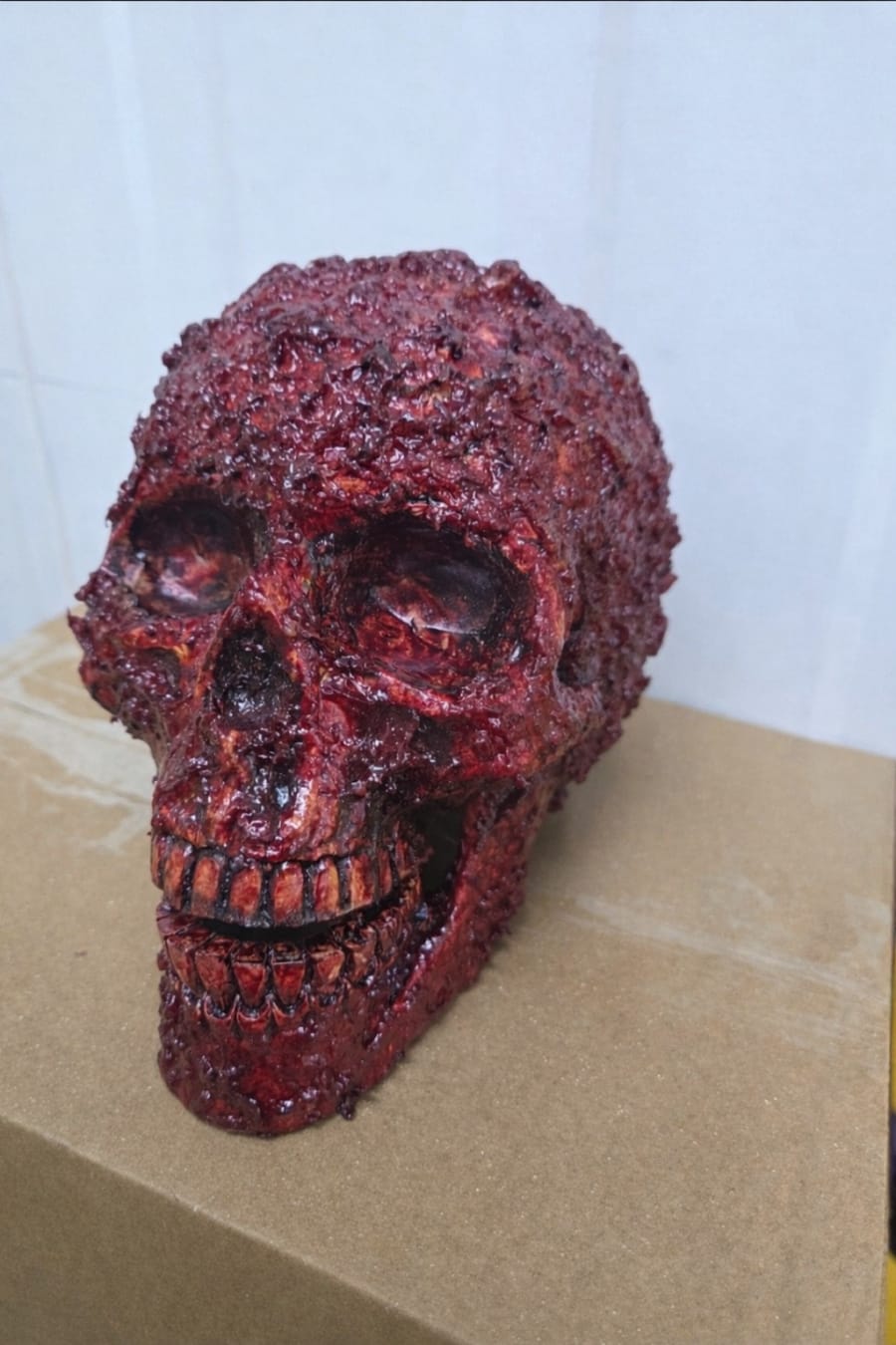 Finished with deep-textured detailing and layered blood effects, this skull delivers a convincing freshly unearthed / post-attack look that reads clearly even in low light.